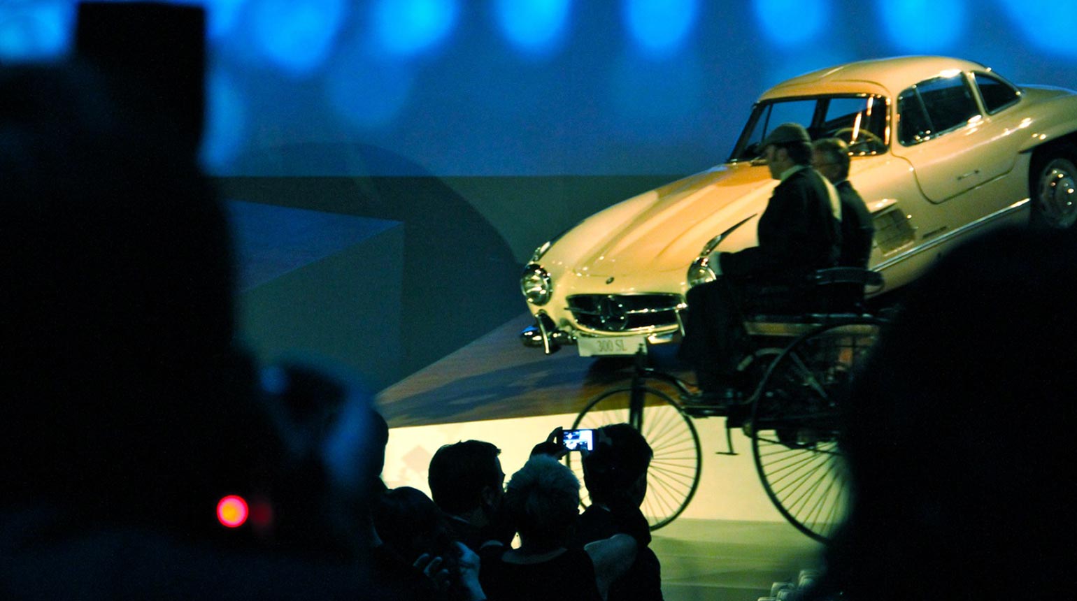 Im Erdgeschoss des Gebäudes erlebten die Gäste eine Ausstellung historischer Modelle. Viele dieser Fahrzeuge waren zum ersten Mal in China zu sehen. Nach der Willkommens-Ansprache durch den Daimler CEO China begaben sich die Gäste zur Dinner-Veranstaltung ins Obergeschoss. Dort erwartete sie eine abwechslungsreiche Reise durch 125 Jahre automobile Geschichte. Natürlich durfte der Benz Patent Motorwagen aus dem Jahre 1886 nicht fehlen. Und Formel 1 Legende Mika Häkkinen stand Rede und Antwort zu seiner Zeit im Mercedes F1 Boliden.